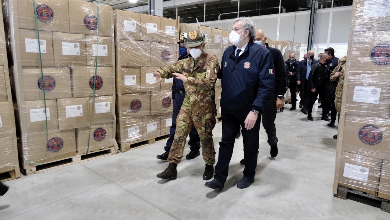 Rivolgendosi al presidente Emiliano, il capo della Protezione Civile Curcio ha detto: “Tu indossi fieramente, e te ne sono grato, il giubbetto della Protezione civile. E io ti voglio dire che ringrazio il sistema di Protezione civile, e il direttore Mario Lerario, perché ha saputo essere interprete, sotto la tua guida, dell’esaltazione delle risorse. La fabbrica di DPI è stata costruita nel sistema di Protezione civile, con la capacità del sistema di Protezione civile, che significa con le capacità della Regione, oltre che del supporto dell’aiuto, della presenza dello Stato. L’hub vaccinale vede la presenza dei volontari del sistema. Il sistema ospedaliero che abbiamo visto poc’anzi è stato costruito anch’esso sotto questa direzione. Io quindi ne sono orgoglioso e fiero, come risposta del territorio che sta a incarnare quella esperienza che noi abbiamo fatto negli anni. E in questa esperienza voglio dire anche un'altra cosa, lo dico chiaramente, l'ho detto altre volte, lo voglio ridire oggi: grazie Puglia. Grazie per la generosità con la quale la Puglia gestisce l'emergenza anche fuori. Ne discutevamo prima rispetto ad altri eventi. La Puglia è sempre pronta, come lo è stata con i colleghi albanesi. Quindi credo che questo sistema di generosità la Puglia lo abbia nel suo DNA e credo che sia opportuno anche segnalarlo, così com'è generoso il suo volontariato di Protezione civile. Io dico, continuiamo così. Io e il commissario lavoriamo spalla spalla, perché questa sfida non è mia, non è sua, è del Paese. Solamente unendo le forze nel territorio, dei sindaci, dei prefetti, dei presidenti delle Regioni, dei commissari del sistema di Protezione civile, che qui trova il suo completamento anche nell'ambito sanitario perché i due grandi asset sono questi. Continuiamo così e usciamo insieme da questo incubo”.