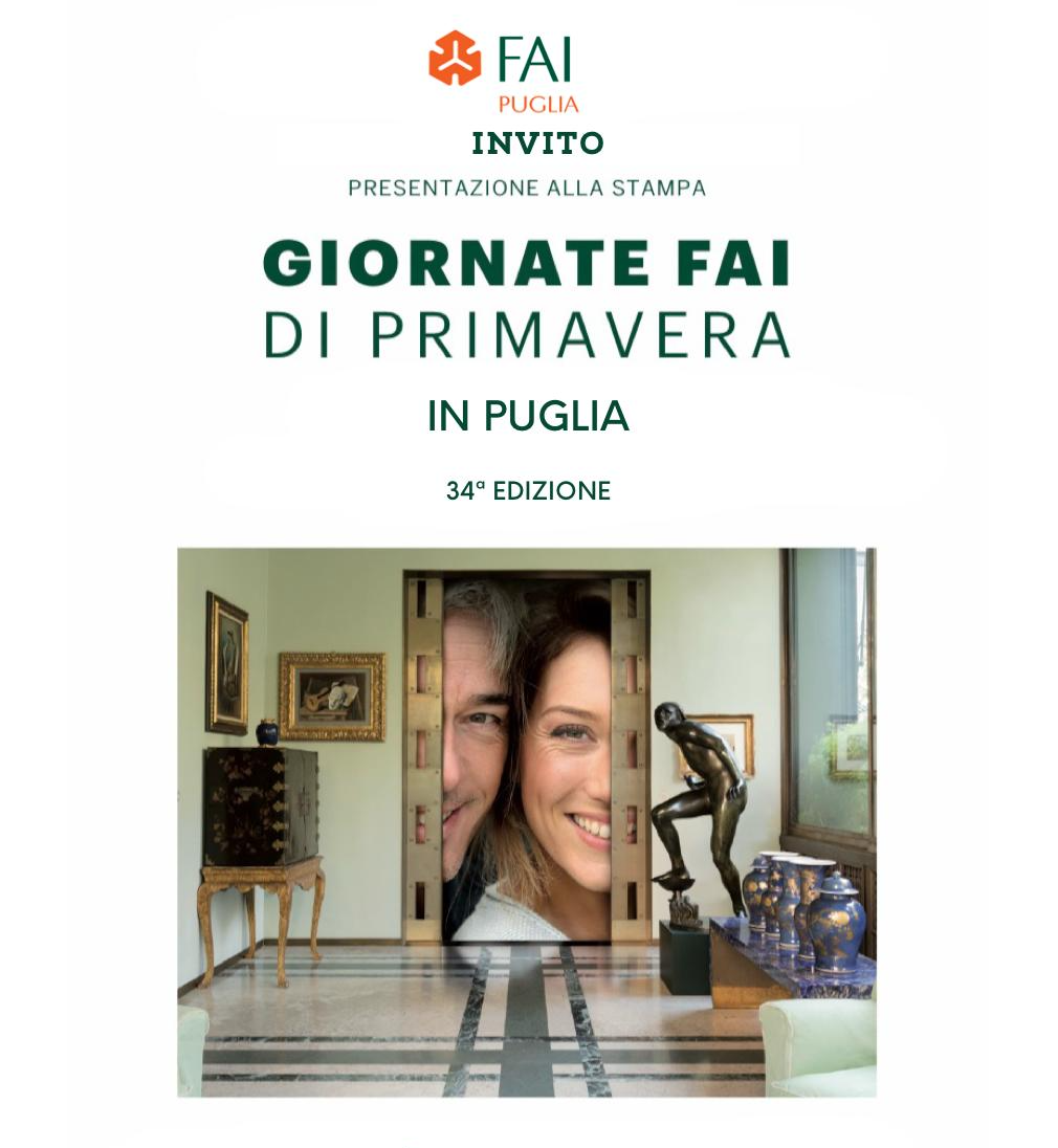 Si terrà domani venerdì 13 marzo alle ore 10.00, nella Sala Di Jeso della Presidenza della Regione Puglia (Lungomare Nazario Sauro 33, Bari), la conferenza stampa di presentazione della 34ª edizione delle Giornate FAI di Primavera in Puglia, l’iniziativa nazionale dedicata alla scoperta e alla valorizzazione del patrimonio culturale e paesaggistico italiano.
