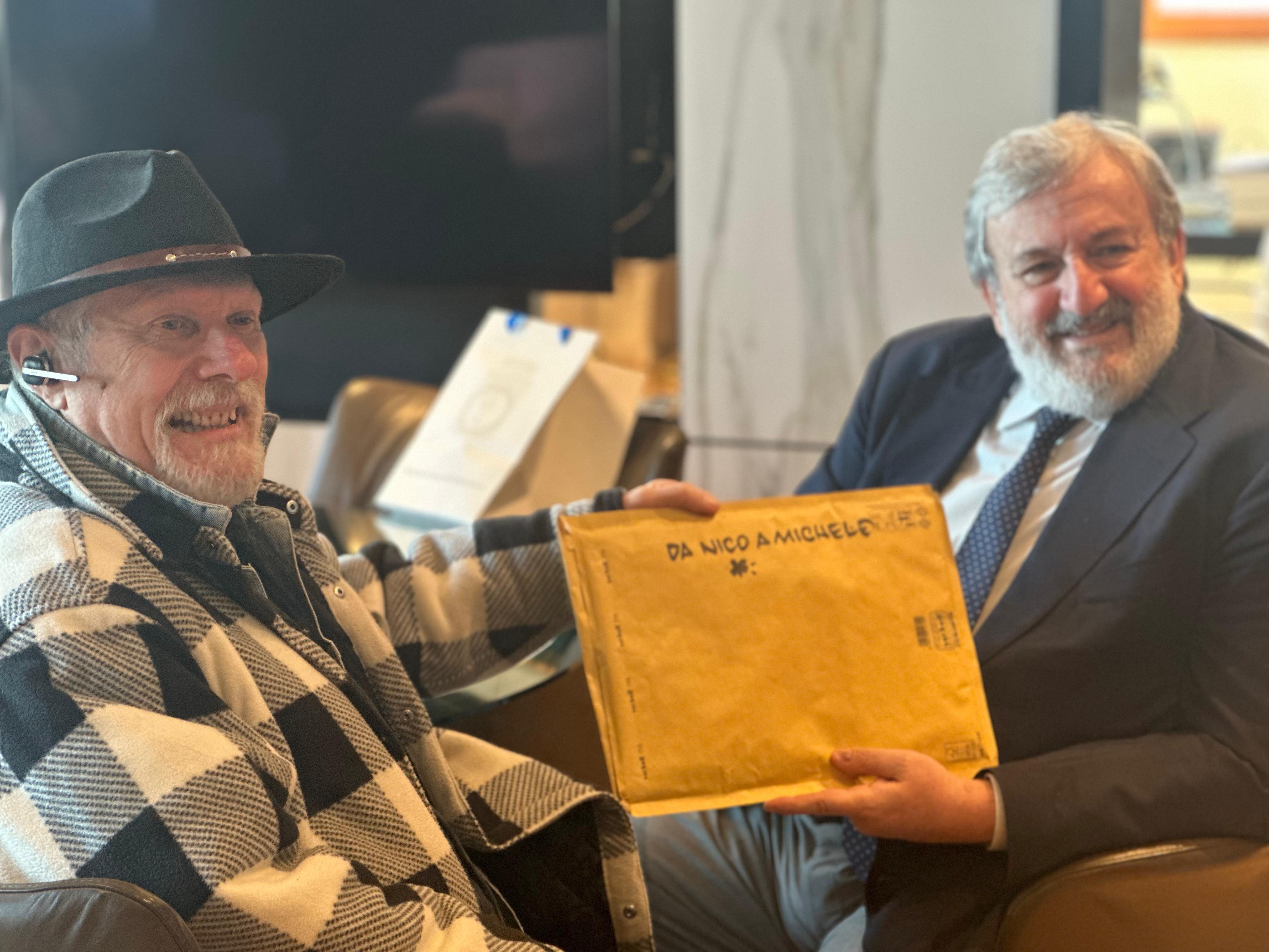 “Una persona straordinaria, una poesia vivente” – ha dichiarato Emiliano – Nico esprime una dolcezza ironica, qualche volta graffiante, che con le sue vignette ha scandito la storia della nostra regione, ma anche la storia d'Italia. Ha ricevuto riconoscimenti prestigiosissimi, come il premio internazionale della satira politica di Forte dei Marmi, una specie di Oscar del vignettismo mondiale. Lui è originario di Taranto, città a me è cara per tanti motivi. L’ho ringraziato per questa visita. Mi ha portato delle vignette autentiche, disegnate a mano per me. Gli ho detto che serviranno come ricordo ai miei nipoti”.
