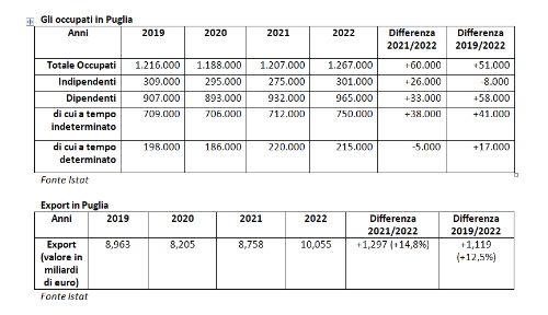 Ottimi risultati anche sotto il profilo delle esportazioni. La crescita della Puglia nel 2022 rispetto al 2021, è stata nell’anno del 14,8%.