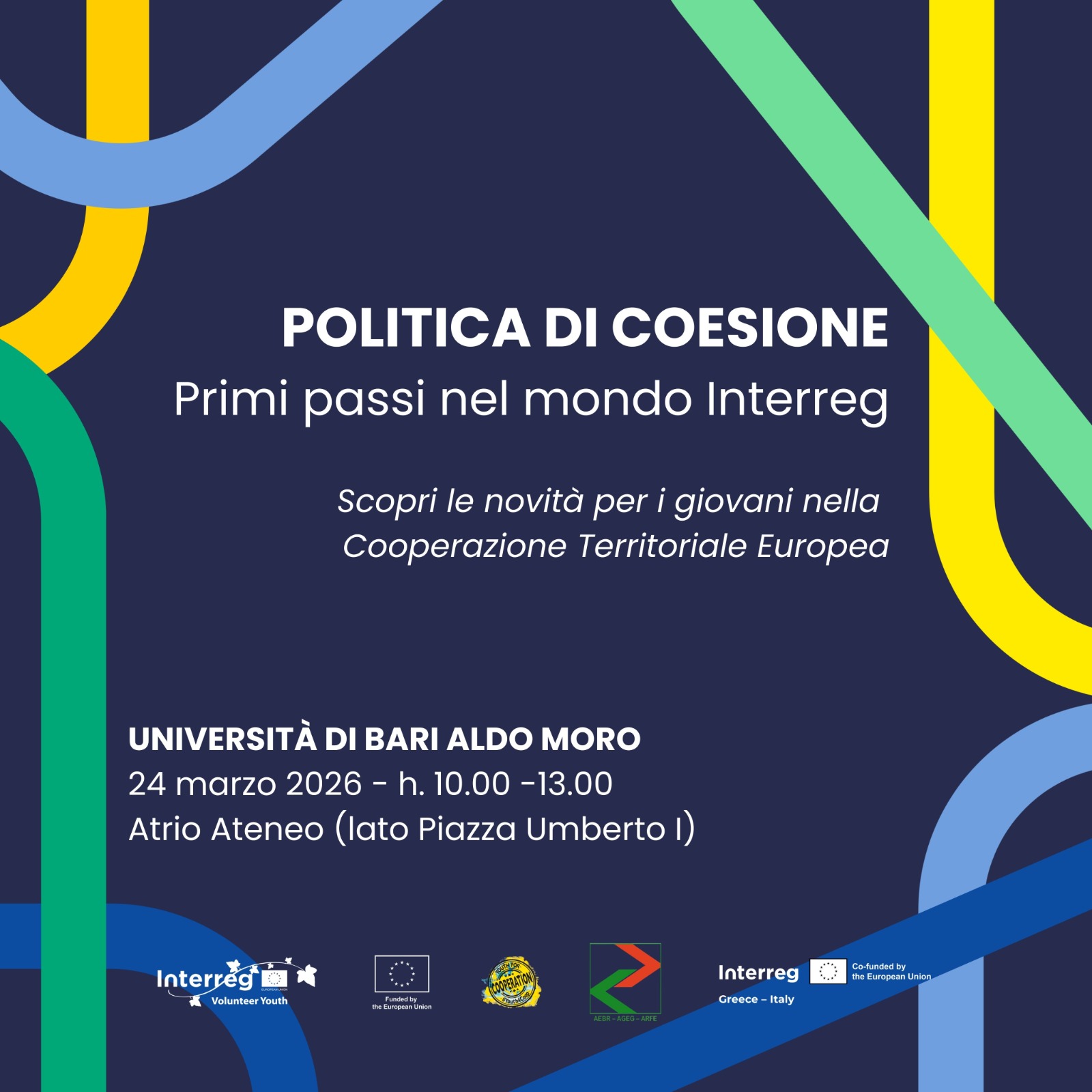 Politica di coesione e cooperazione territoriale. Tutte le novità e le opportunità per i giovani saranno presentate nell’evento dal titolo “Politica di coesione: primi passi nel mondo Interreg” in programma il 24 marzo 2026, dalle ore 10.00 alle ore 13.00, nell’atrio dell’Università di Bari Aldo Moro (lato Piazza Umberto I). Quanto la politica di coesione influisce sulla vita quotidiana dei giovani, come i programmi Interreg investono nella crescita e nell’occupazione e qual è il ruolo dei giovani nella promozione della cooperazione tra le regioni europee: tanti i temi che saranno affrontati durante la mattinata in un evento dal format agile, informale e destrutturato, basato sul contatto diretto con la comunità universitaria (studenti, laureandi e neolaureati).