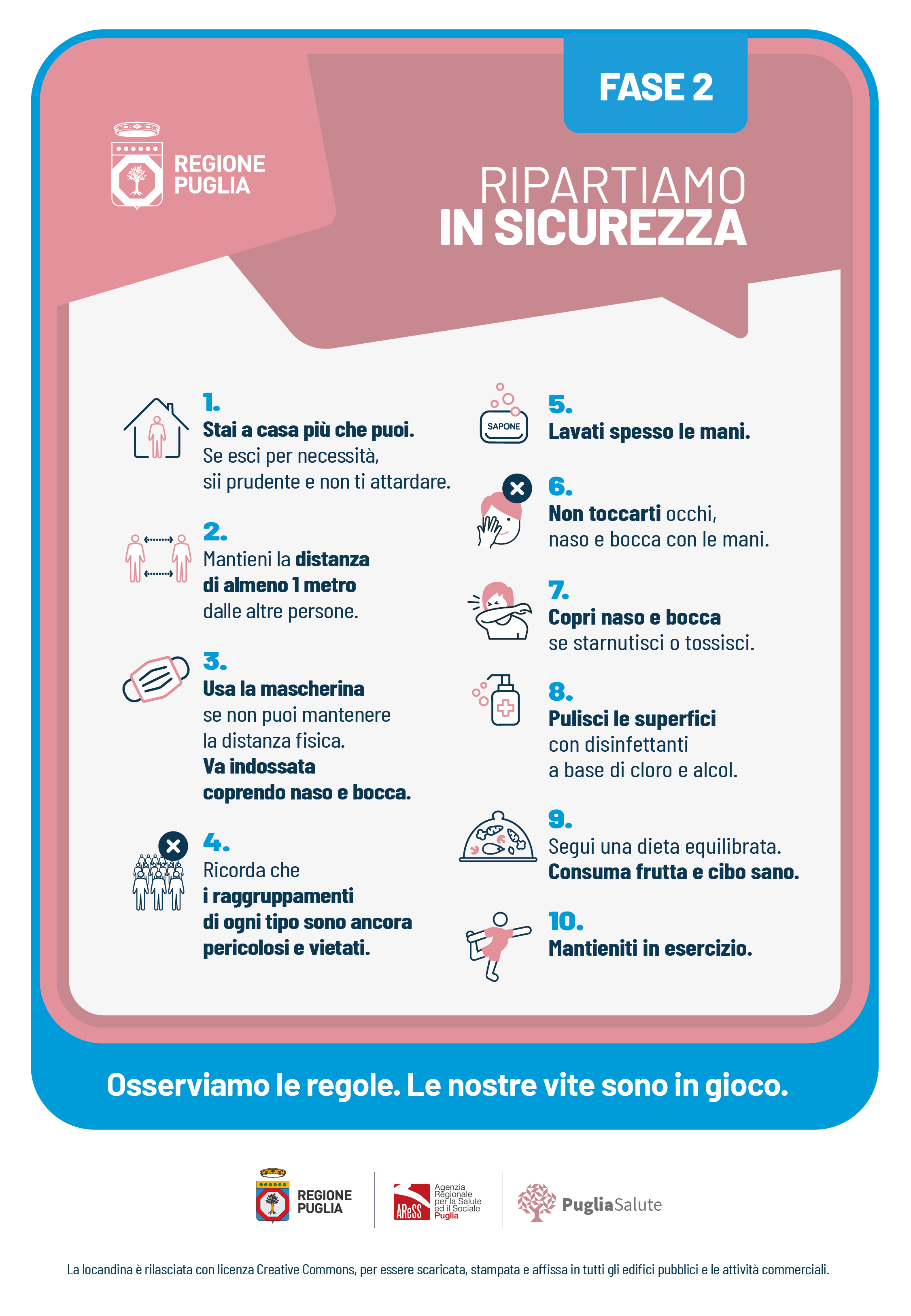 dopo il lockdown messo in atto dal Governo per contrastare l’epidemia Covid siamo alla vigilia della Fase 2, che inizierà lunedì 4 maggio 2020. Una fase ancor più delicata per noi tutti, perché potremo riprendere qualche attività secondo quanto previsto dalle norme nazionali e regionali.