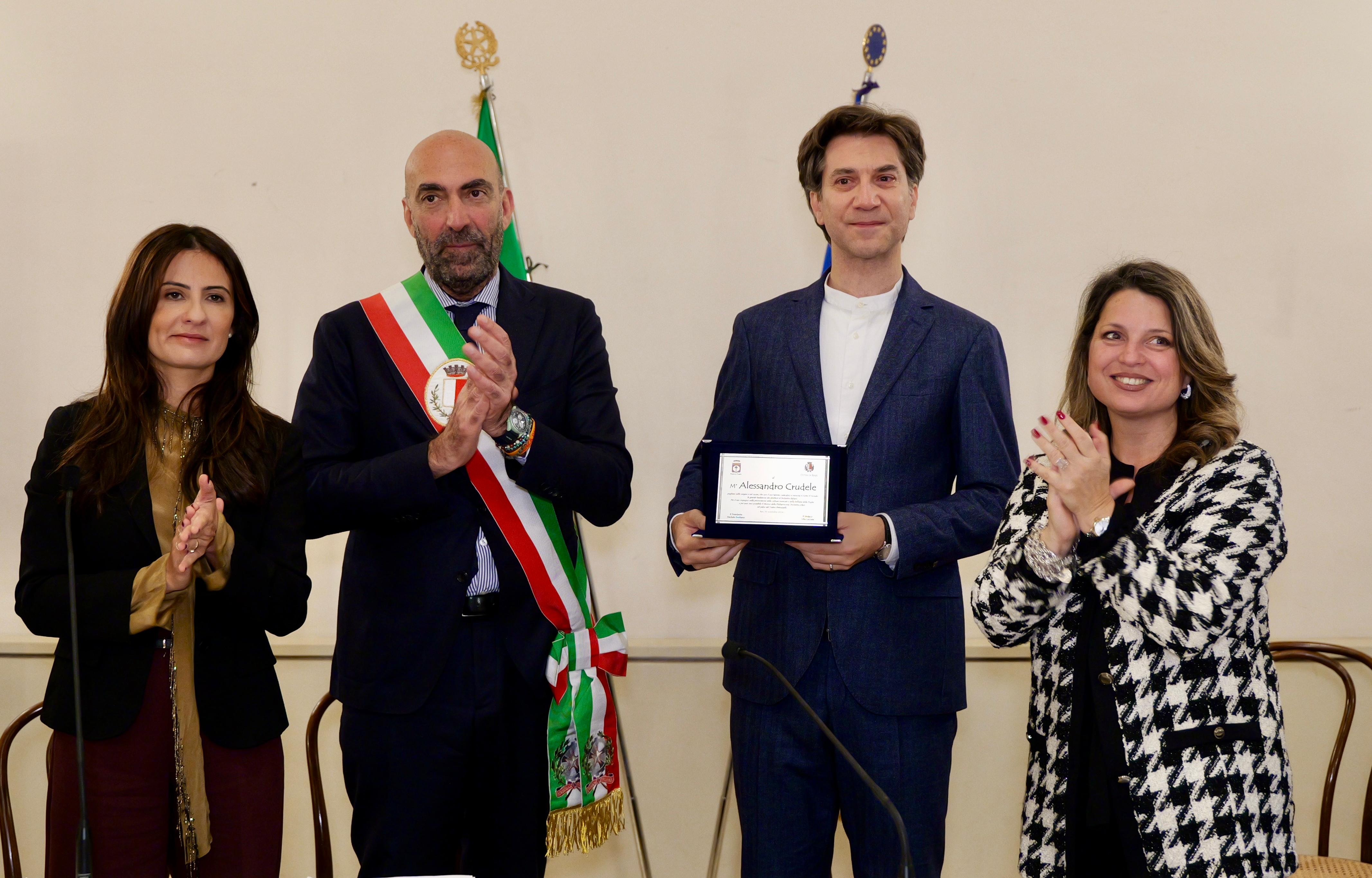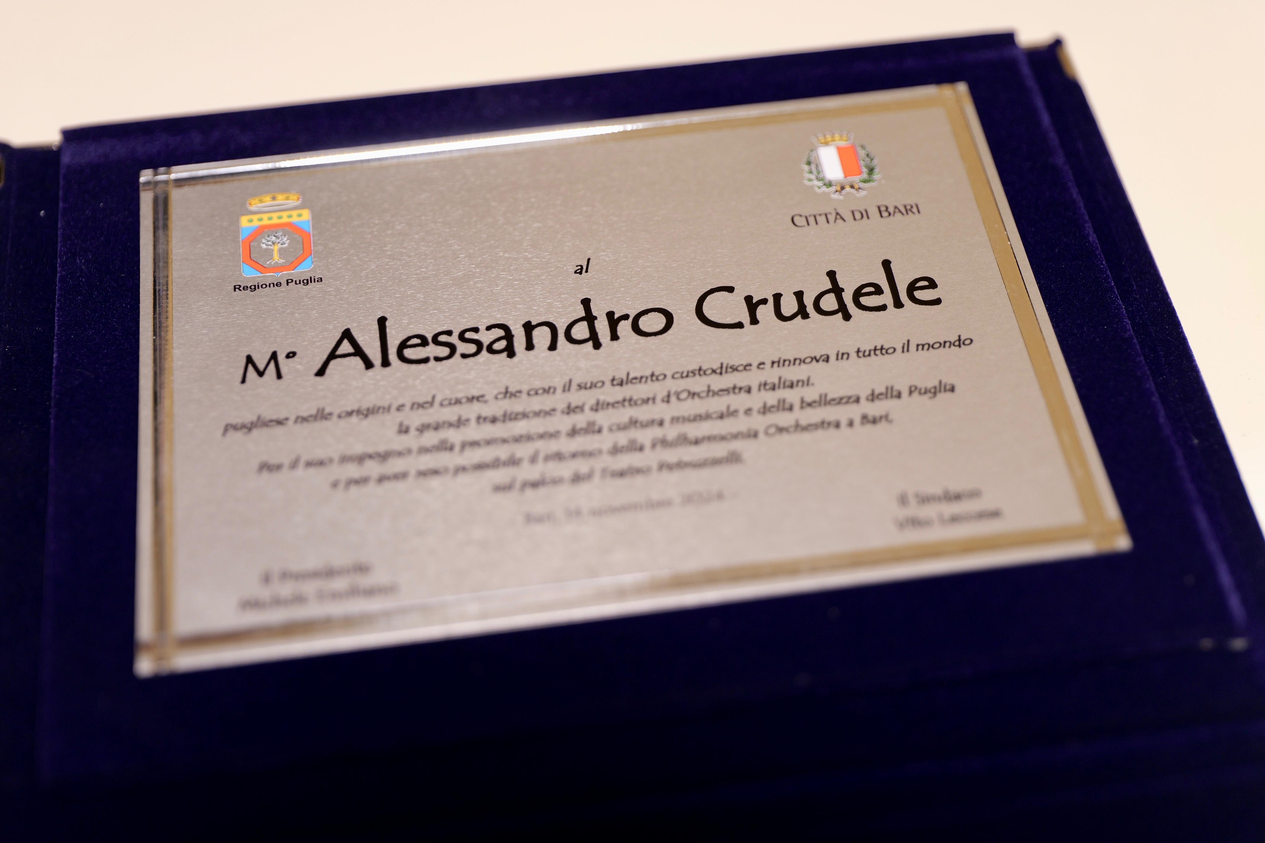 Al termine della conferenza, Matrangola, Leccese e Romano hanno consegnato ad Alessandro Crudele una targa di riconoscimento della Regione Puglia e dell’Amministrazione comunale, che recita: “Al Maestro Alessandro Crudele, pugliese nelle origini e nel cuore, che con il suo talento custodisce e rinnova in tutto il mondo la grande tradizione dei direttori d’Orchestra italiani. Per il suo impegno nella promozione della cultura musicale e della bellezza della Puglia e per aver reso possibile il ritorno della Philharmonia Orchestra a Bari, sul palco del Teatro Petruzzelli”.