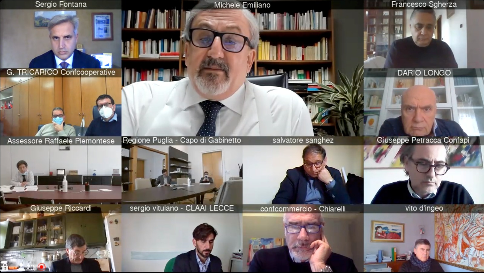 All’incontro erano presenti il Presidente della Regione Puglia Michele Emiliano, l’Assessore regionale al Bilancio Raffaele Piemontese, il capo di Gabinetto, Claudio Stefanazzi, il vice Capo di Gabinetto Domenico De Santis, il Dirigente regionale di Sezione Programmazione Unitaria Pasquale Orlando e i rappresentanti regionali di Confindustria, Confartigianato, Confcooperative, CNA, Confesercenti, CLAAI e Confcommercio, CONFAPI e Legacoop.