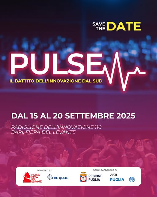 PULSE è il padiglione dell’innovazione della Fiera del Levante 2025: dal 15 al 20 settembre startup, scuole, istituzioni e cittadini si incontreranno per ascoltare, creare, connettersi e sperimentare. L’obiettivo è quello di dare voce al battito creativo e tecnologico del Sud, favorendo contaminazione, co-progettazione e sperimentazione.
