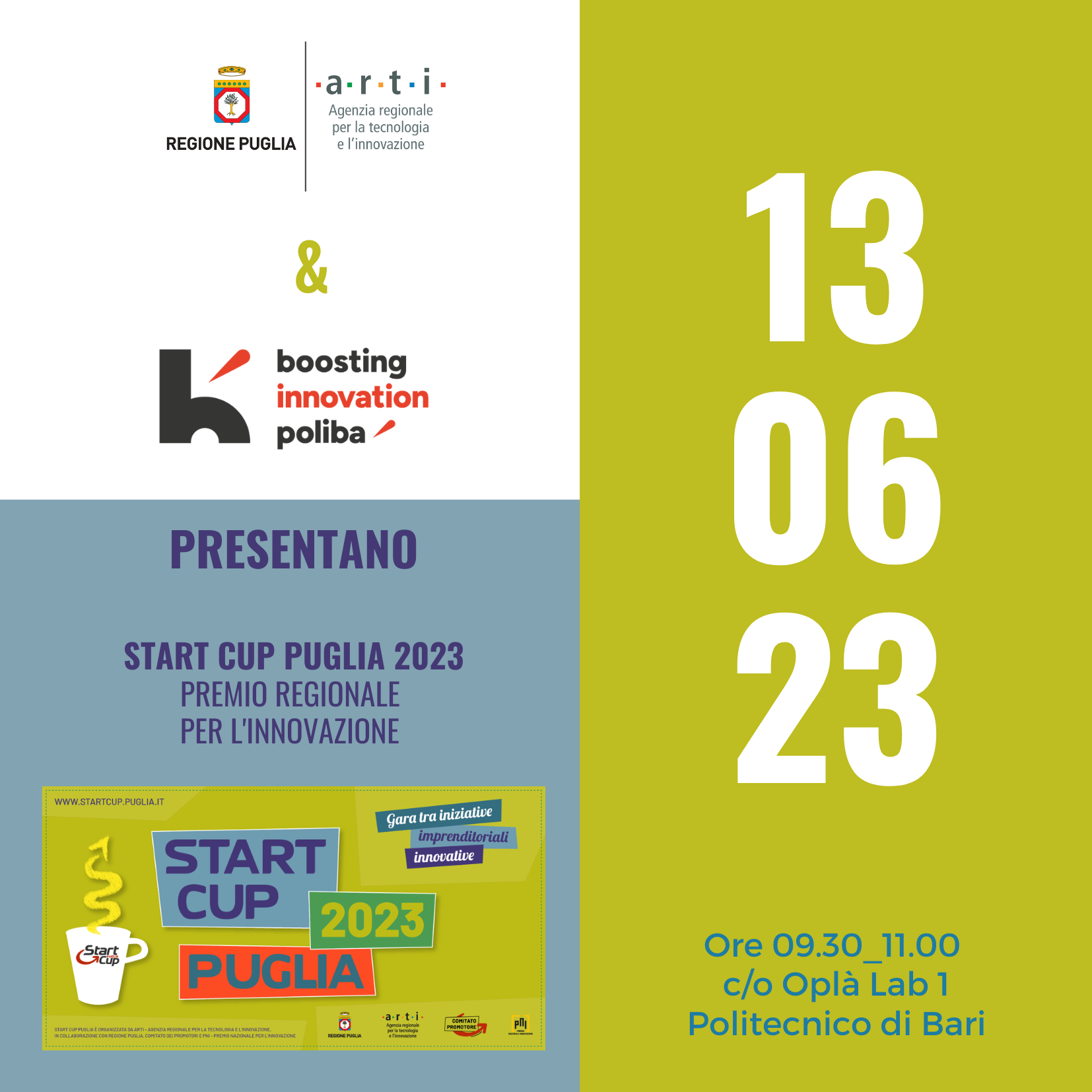Prosegue il tour di presentazione della 16esima edizione della StartCup Puglia. Dopo Il Taranto Innovation Summit, il 13 giugno dalle ore 9.30 alle 11, allo spazio Oplà del Politecnico di Bari (Via E. Orabona, 4), ARTI (Agenzia Regionale per la Tecnologia e l’Innovazione) e BINP – Boosting Innovation in Poliba, incubatore promosso da Politecnico di Bari e partecipato da PoliBA, ANCE Bari-BAT e Confindustria Bari-BAT, presentano a studenti, ricercatori e aspiranti startupper il Premio regionale per l’Innovazione.