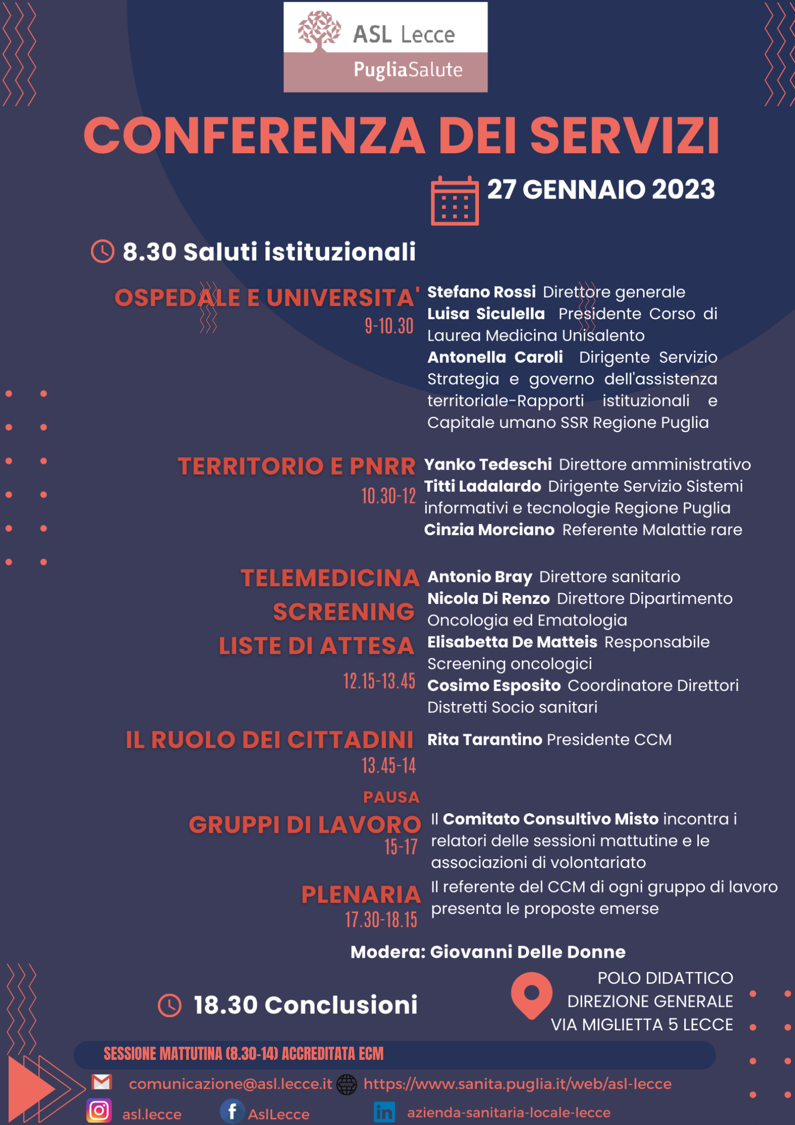 Il 27 gennaio si terrà a Lecce, presso il Polo didattico di via Miglietta 5, la Conferenza dei Servizi organizzata da ASL di Lecce, un’importante occasione di confronto tra l'Azienda sanitaria, le associazioni e i cittadini, per discutere dei risultati raggiunti e per esporre i nuovi obiettivi.