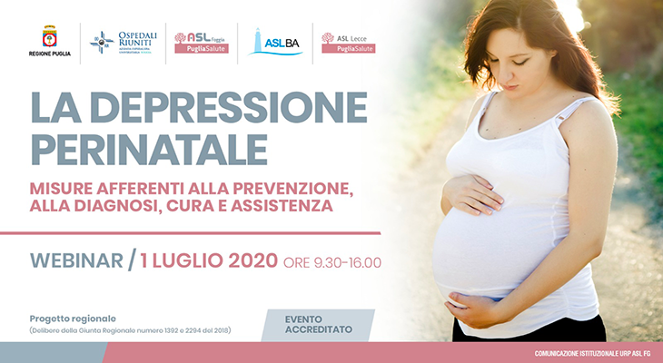 Mercoledì 1° luglio 2020 dalle 9.30 alle 16.00 ASL Bari, Azienda Ospedaliero-Universitaria Ospedali Riuniti di Foggia, ASL Foggia e ASL Lecce organizzano il webinar del progetto regionale "Misure afferenti alla prevenzione, alla diagnosi, cura e assistenza della sindrome depressiva perinatale".