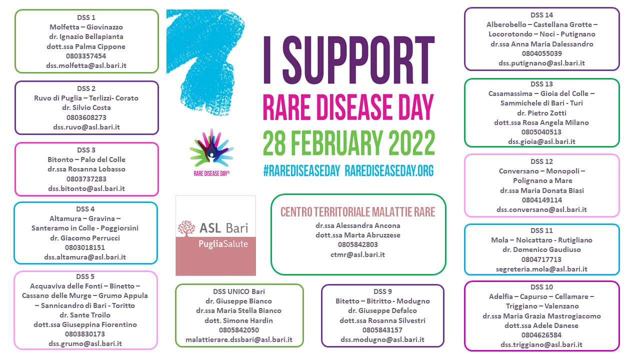 Nei giorni 26, 27 e 28 febbraio 2022, la Torre della Città Metropolitana di Bari sarà illuminata con i colori fucsia, verde e celeste. L’ASL del capoluogo offre anche un prospetto con i contatti utili per ogni distretto sanitario.