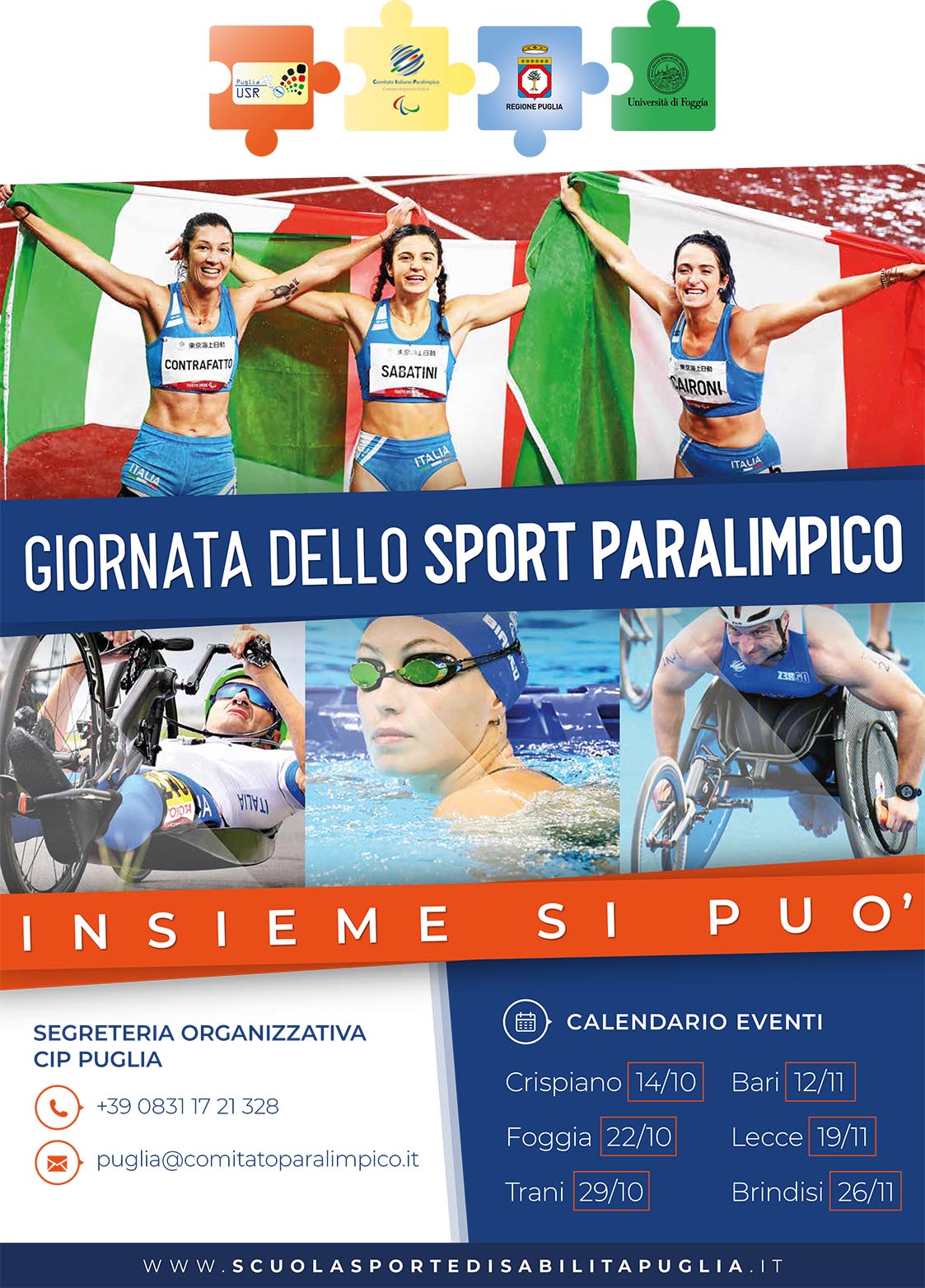 Il via giovedì 14 ottobre con le sei "Giornate dello sport paralimpico - Insieme si può": si parte da Crispiano (Taranto), segue Foggia il 22 ottobre, Trani (Bat) il 29, Bari il 12 novembre, Lecce il 19 e Brindisi il 26 novembre.