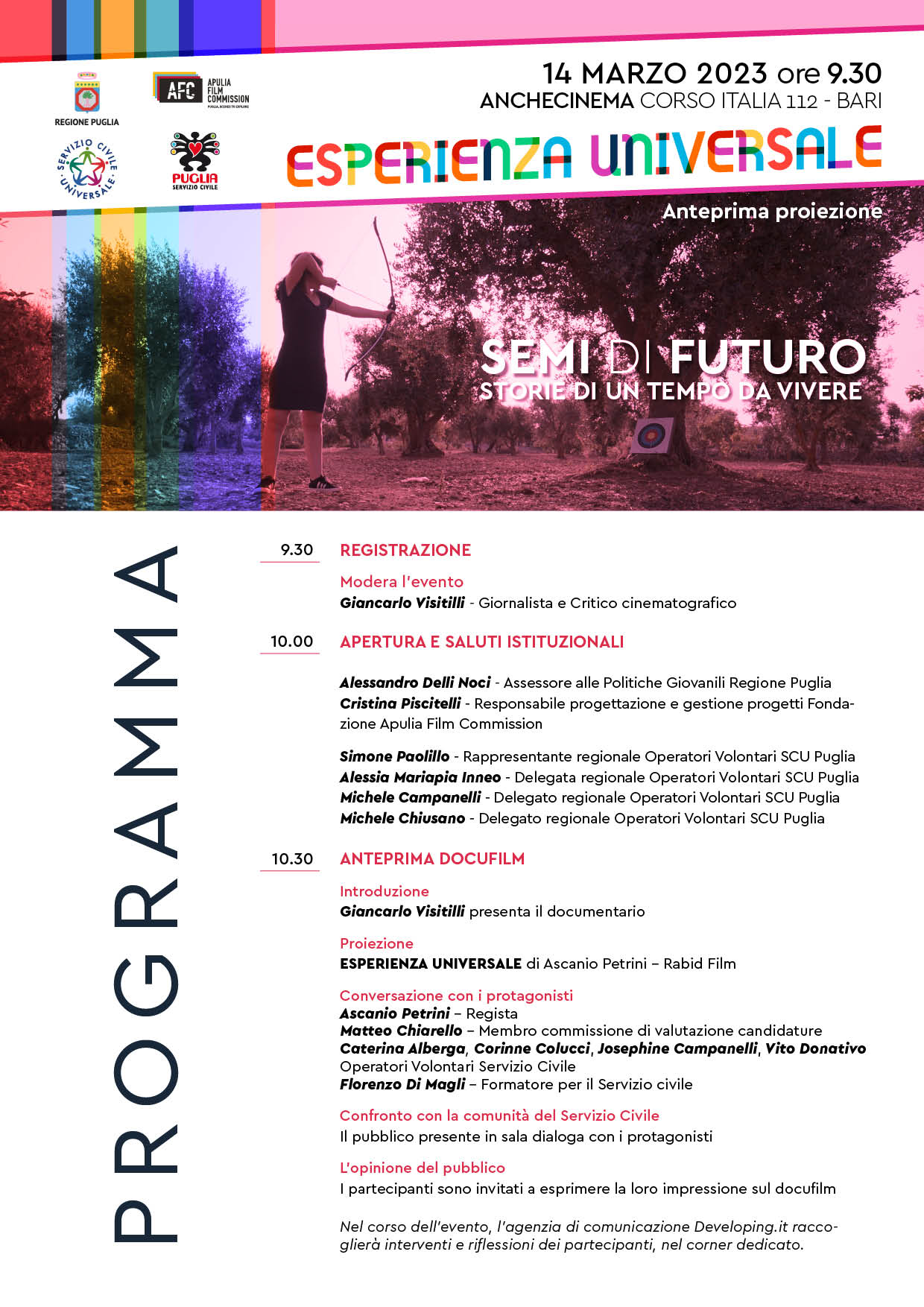 Nella sala dell'AncheCinema di Bari è stato proiettato, per la prima volta, Esperienza Universale, il docufilm diretto dal regista pugliese Ascanio Petrini e prodotto da Rabidfilm per Regione Puglia e Apulia Film Commission.