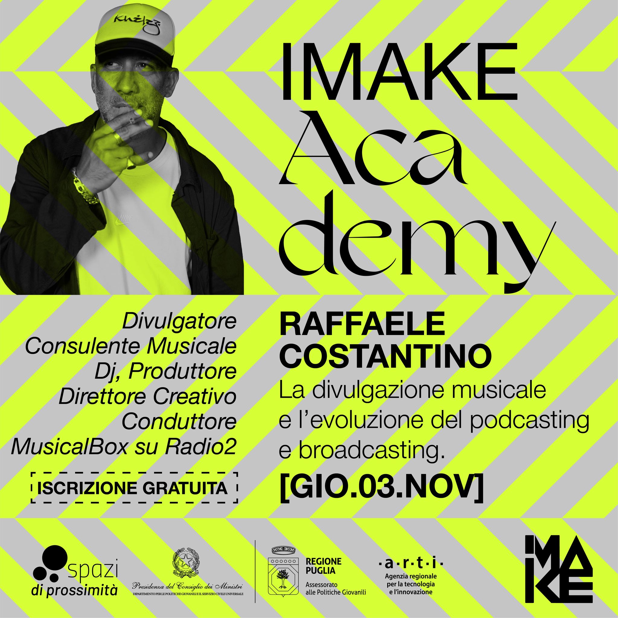 Tutti gli appuntamenti di I MAKE Academy 2022 sono gratuiti e prenotabili compilando il seguente form: https://forms.gle/kGPbCcz6yi4hXQT97 e si terranno nella sala interna dell'Ex Macello di Putignano (BA) negli orari stabiliti.