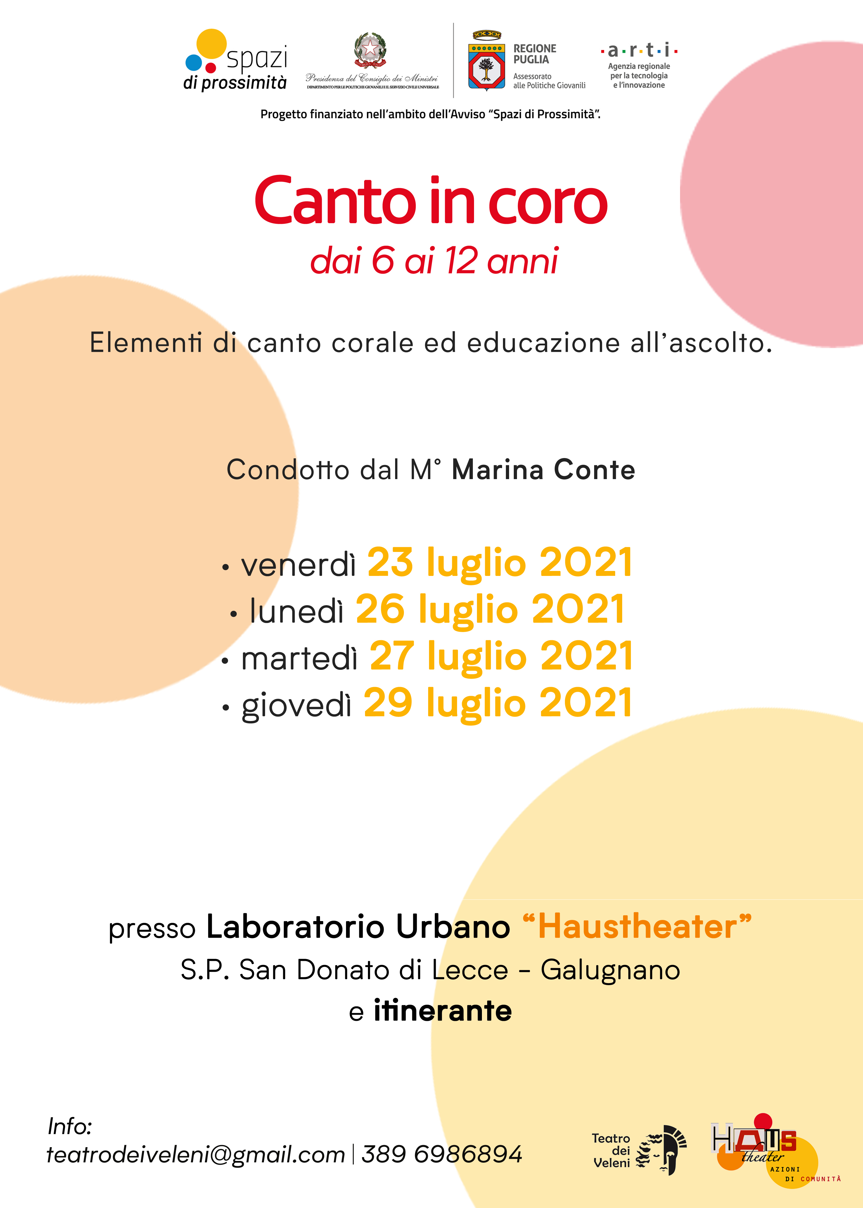 Oggi ha ufficialmente inizio “Canto in Coro”, attività prevista dal progetto “Haustheater – Azioni di Comunità” a cura della Soc. Coop. Teatro dei Veleni, finanziato nell’ambito dell’Avviso pubblico Spazi di Prossimità.