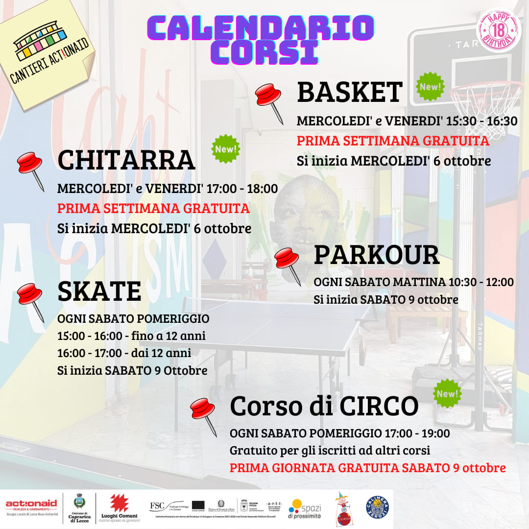 Con un fitto programma di attività, ce n’è per tutti i gusti! Corsi di BASKET, di CHITARRA, di PARKOUR, di SKATE. Ogni sabato pomeriggio Corso di CIRCO.