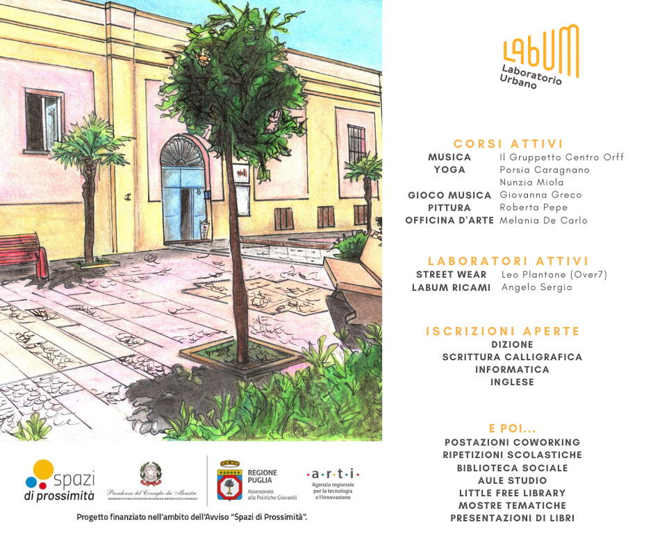 Le iniziative sono inserite all’interno del progetto “Co-LabUM” e finanziate dall’Avviso pubblico "Spazi di Prossimità" promosso da Regione Puglia - Politiche Giovanili e da ARTI Puglia.