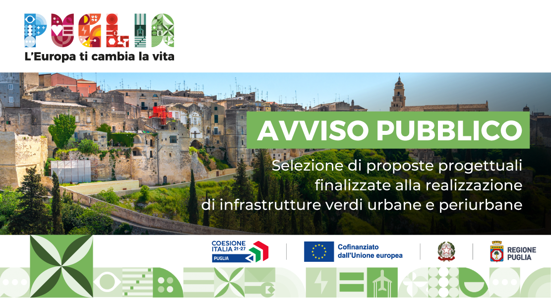Con Atto Dirigenziale n 55 del 17 marzo 2026 della Sezione Tutela e Valorizzazione del Paesaggio della Regione Puglia è stata approvata la graduatoria provvisoria relativa all’Avviso pubblico PR Puglia 2021-2027 - Priorità II “Economia verde” - Azione 2.13 “ Interventi di infrastrutturazione verde del territorio” - sub- Azione 2.13.2 “Infrastrutturazione verde e nature based solutions in ambito urbano e periurbano” - Avviso pubblico per la selezione di proposte progettuali finalizzate alla realizzazione di infrastrutture verdi urbane e periurbane.