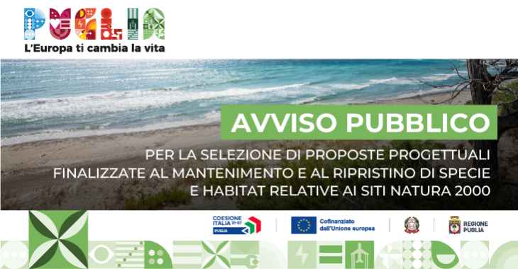 Con Determinazione del Dirigente Servizio parchi e tutela della biodiversità n. 59 del 25 giugno 2025, pubblicata sul Bollettino Ufficiale della regione Puglia n. 57 del 17 luglio 2025, è stato approvato l’Avviso pubblico PR Puglia FESR-FSE+ 2024/2027 - Azione 2.11 “Interventi per la tutela e il ripristino della biodiversità”. – “Avviso per la selezione di proposte progettuali finalizzate al mantenimento e al ripristino di specie e habitat relative ai siti Natura 2000” – Disposizione di accertamento in entrata e contestuale assunzione di obbligazione non perfezionata. Approvazione Avviso.