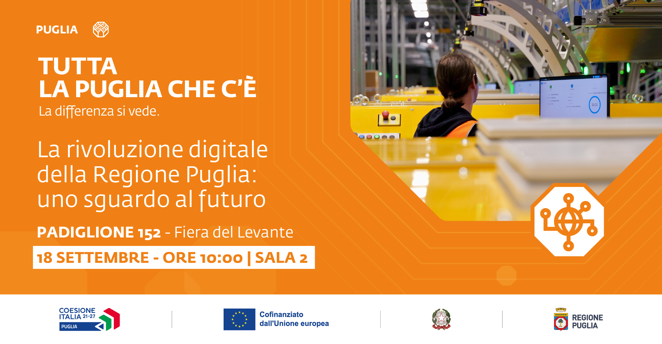In occasione dell'88ª edizione della Fiera del Levante, il cui tema è “Tutta la Puglia che c’è: la differenza si vede”, il Dipartimento per la Transizione Digitale della Regione Puglia organizza un incontro pubblico per raccontare le principali tappe della trasformazione digitale del territorio e tracciare il percorso dei prossimi anni.