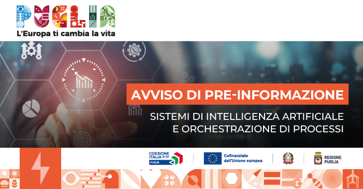 Con Deliberazione n. 1048 del 29 luglio 2025, pubblicata sul BURP n. 62 del 4 agosto 2025, la Giunta Regionale ha approvato la scheda di pre-informazione relativa all’Avviso di selezione per il finanziamento di proposte progettuali finalizzate a supportare gli Enti locali nella valorizzazione dei dati in proprio possesso attraverso l’adozione di sistemi di intelligenza artificiale e/o di sistemi per l’orchestrazione dei processi nell'ambito dell' Asse Prioritario I - “Competitività e Innovazione” – Azione 1.8 “Interventi di digitalizzazione della P.A. e diffusione di infrastrutture e servizi digitali a favore di cittadini ed imprese”.