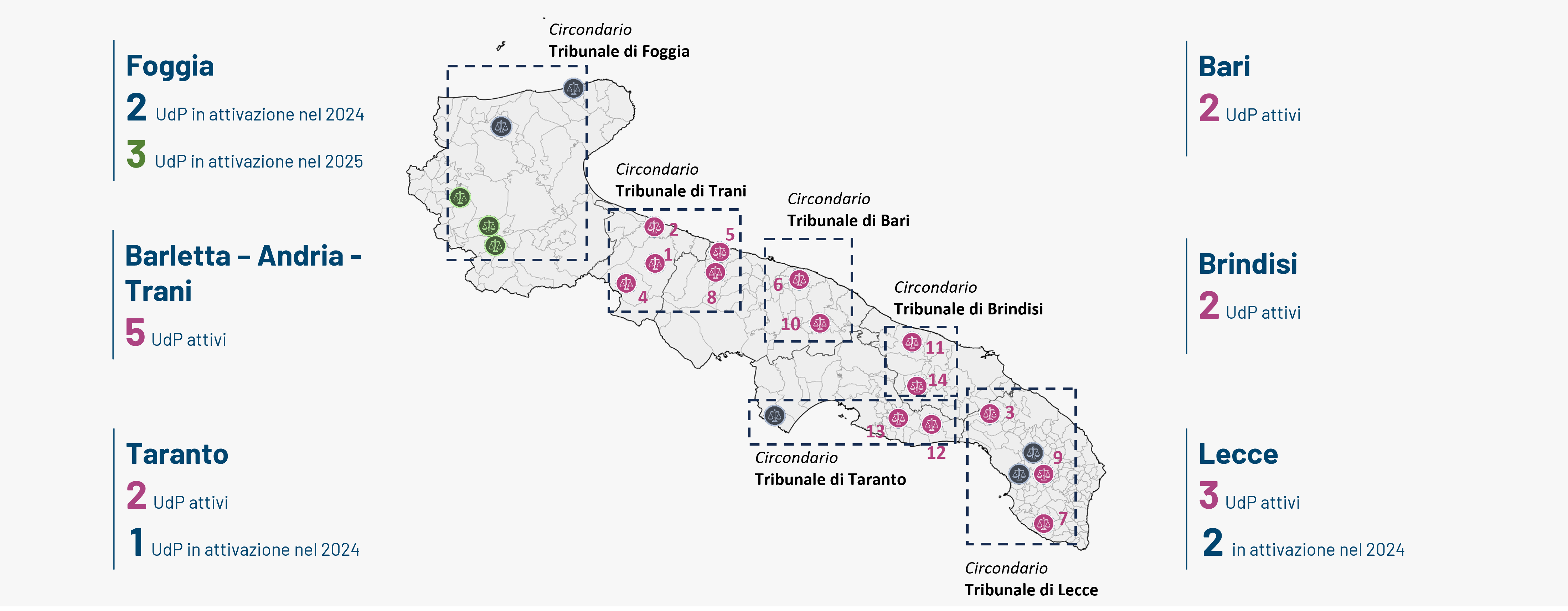 Con questa apertura, salgono a 14 gli Uffici di Prossimità operativi nella Regione Puglia, distribuiti nei seguenti Comuni/ Unioni di Comuni: