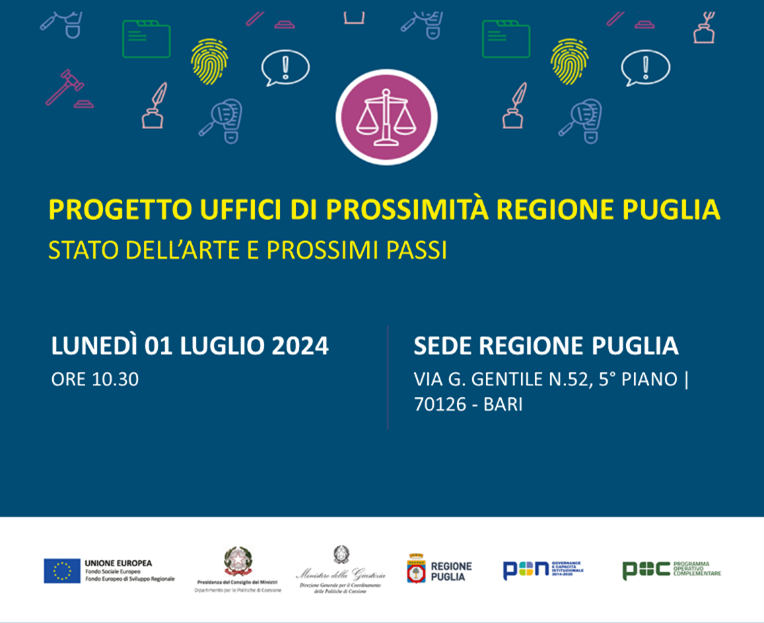 La Regione Puglia è lieta di annunciare l'evento "Progetto Uffici di Prossimità in Regione Puglia: stato dell’arte e prossimi passi", che si terrà lunedì 1° luglio 2024 al quinto piano della sede della Regione Puglia in Via G. Gentile, 52 - 70126 Bari. L'evento avrà inizio alle 10:30 e vedrà la partecipazione di rappresentanti del governo regionale, delle istituzioni locali, del Ministero della Giustizia, delle Corti d'Appello, dei Tribunali pugliesi e degli enti locali coinvolti. Durante l'incontro saranno presentati i primi risultati ottenuti, le sfide affrontate e le prospettive future del progetto. L'evento rappresenterà un'opportunità unica per approfondire il ruolo degli Uffici di Prossimità come punti di riferimento locali per servizi informativi, assistenziali e di orientamento in materia di volontaria giurisdizione per i cittadini.