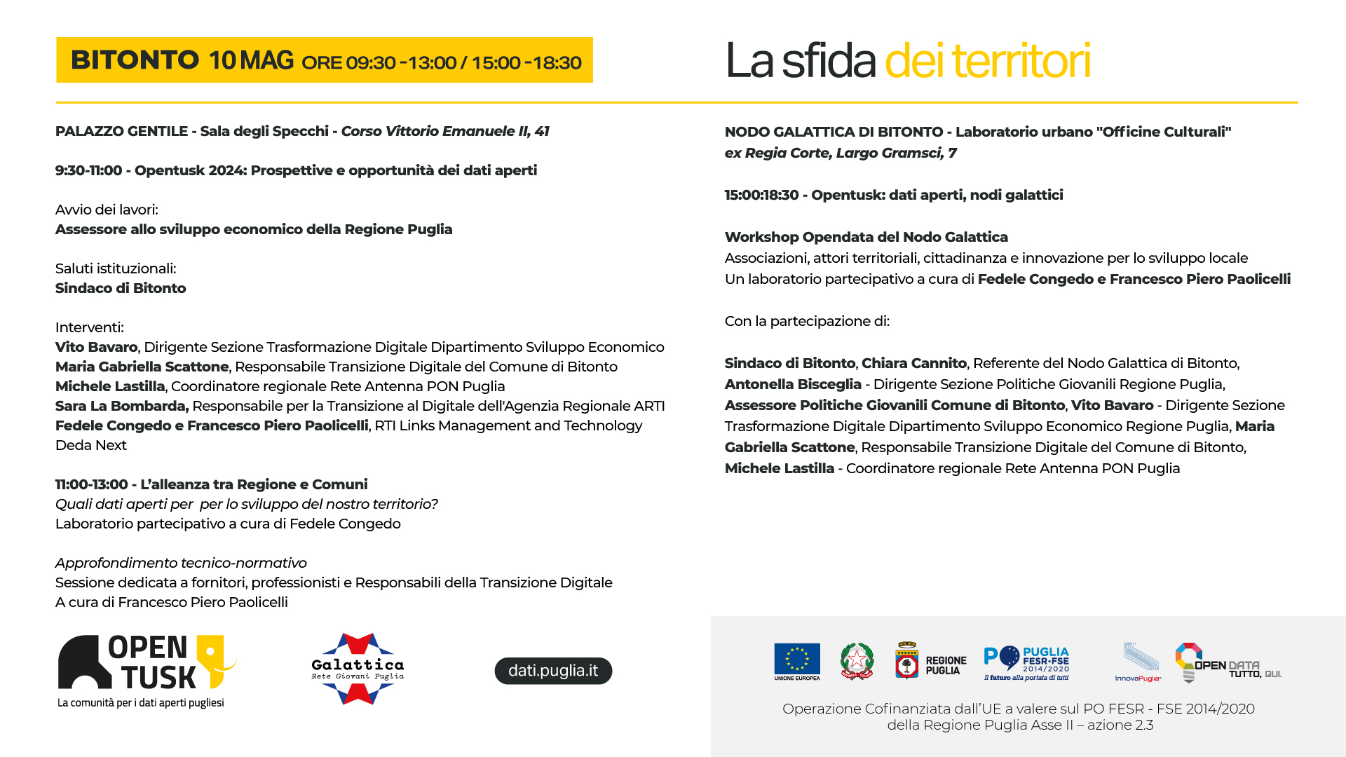 Venerdì 10 maggio 2024 si attuano a Bitonto i due workshop Opentusk per la Provincia di Bari, in collaborazione con l’Istituzione Comunale: