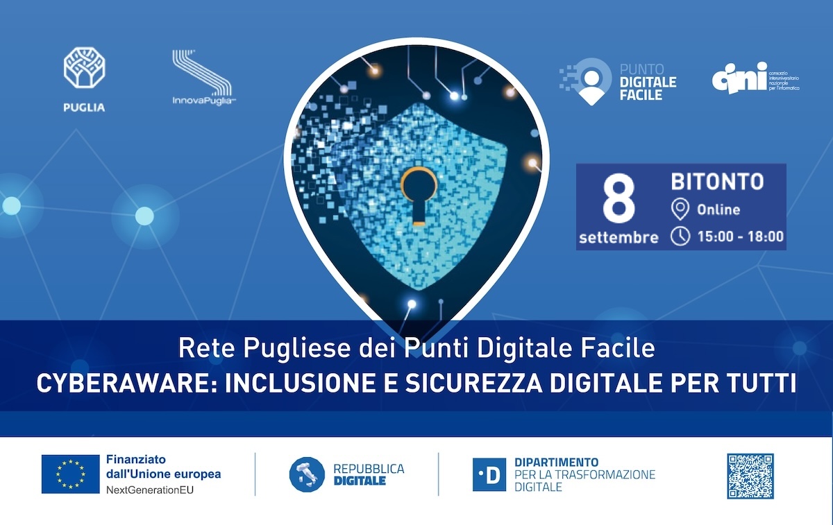“CyberAware: Inclusione e Sicurezza Digitale per Tutti” è un'iniziativa prevista nell'ambito del progetto “Rete dei servizi di facilitazione digitale” promosso dal Dipartimento Sviluppo Economico della Regione Puglia con la collaborazione di InnovaPuglia SpA, finanziato con le risorse del PNRR - Investimento 1.7.2, nell’ambito del progetto nazionale del Dipartimento per la Trasformazione Digitale (DTD).