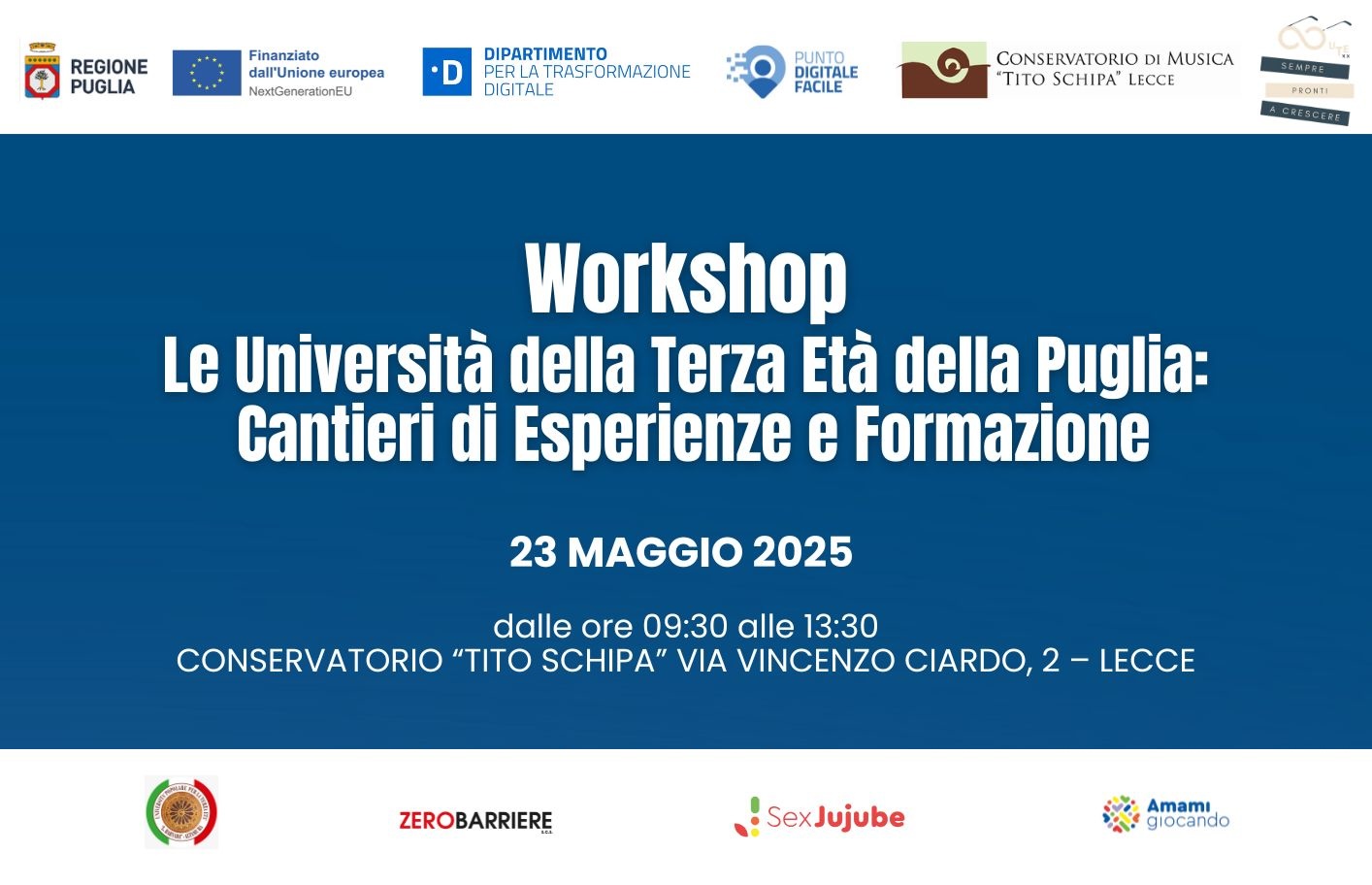 La Regione Puglia, nell’ambito delle iniziative dei due Punti Digitale Facile attivati a Bari e a Lecce dalla Struttura speciale Comunicazione istituzionale, in collaborazione con le Università della Terza Età di Puglia e con il Conservatorio "Tito Schipa" di Lecce, organizza il workshop "Le Università della Terza Età della Puglia: Cantieri di Esperienze e Formazione". L’incontro si terrà venerdì 23 maggio 2025, dalle ore 9:30 alle 13:30, presso il Conservatorio del capoluogo salentino, in via V. Ciardo, 2 .