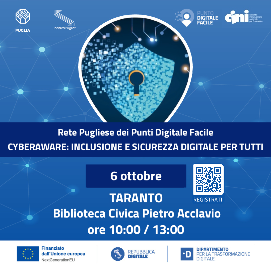Continua il ciclo di incontri “CyberAware: Inclusione e Sicurezza Digitale per Tutti” con il sesto appuntamento a Taranto.