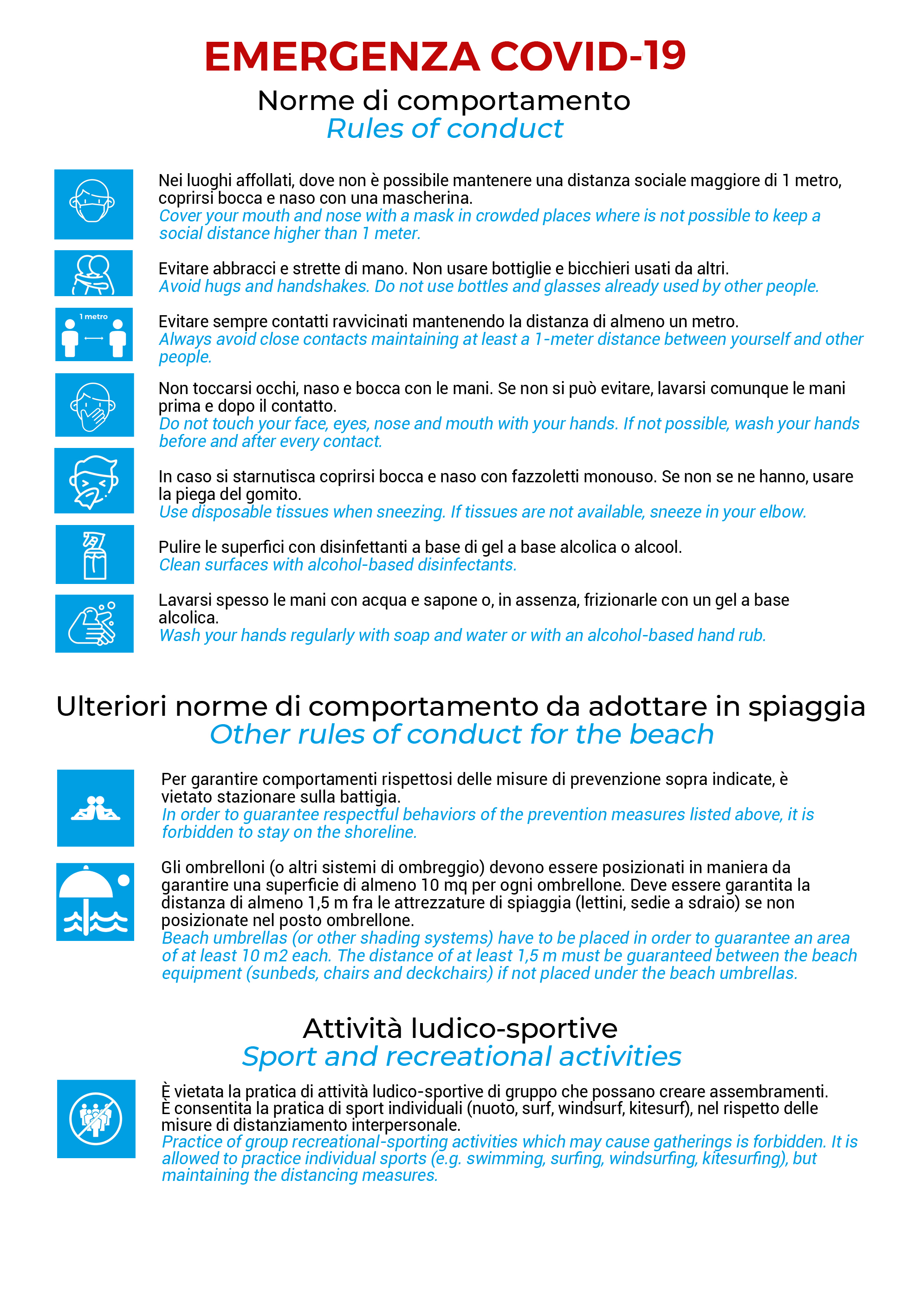 Fra le prescrizioni previste per la stagione balneare 2020 rientrano le misure di prevenzione dal contagio da COVID-19, la necessità di esporre su cartellonistica informativa le regole di comportamento da seguire e la possibilità, per i Comuni, di svolgere attività di sorveglianza su siti specifici.