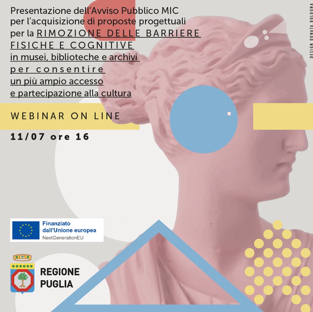 La Regione Puglia - Dipartimento Turismo, Economia della Cultura e Valorizzazione del territorio, organizza per il giorno 11 luglio - alle ore 16, un webinar per illustrare gli Avvisi emanati dalla Direzione generale Musei del Ministero della cultura per la presentazione di proposte progettuali di intervento per la rimozione delle barriere fisiche, cognitive e sensoriali dei musei e luoghi della cultura privati e pubblici non appartenenti al Ministero della Cultura, da finanziare nell’ambito del PNRR.