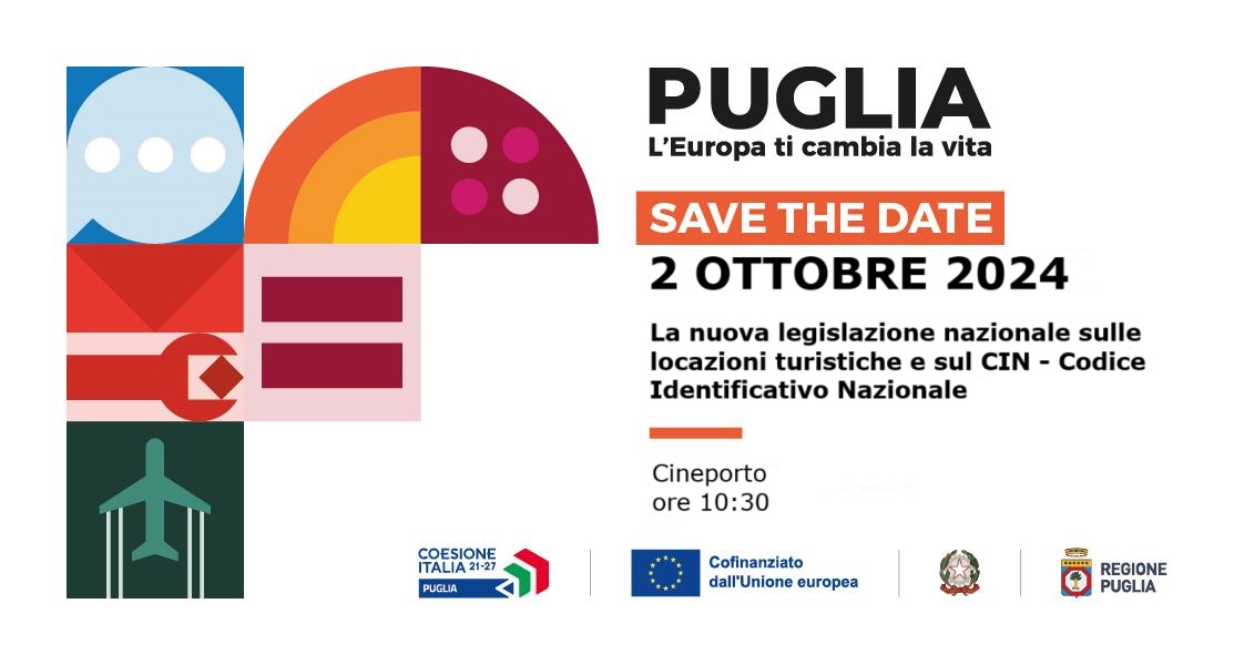 È in programma mercoledì 2 ottobre, dalle ore 10.30 alle ore 11.30, presso il Cineporto sito all’interno della Fiera del Levante, l’incontro avente ad oggetto “La nuova legislazione nazionale sulle locazioni turistiche e sul CIN - Codice Identificativo Nazionale”, organizzato dalla Sezione Turismo e Internazionalizzazione della Regione Puglia.