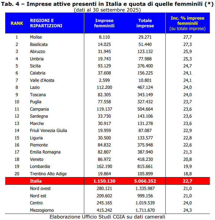 La CGIA (Associazione Artigiani Piccole Imprese) di Mestre pubblica una nota statistica sull'imprenditoria femminile italiana.