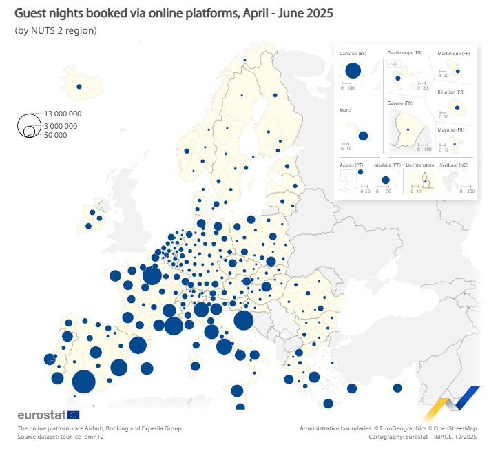 L'ufficio statistico europeo (Eurostat) pubblica una nota statistica sulle prenotazioni online di affitti brevi effettuate tramite le principali piattaforme di booking online. I dati pubblicati sono al terzo trimestre 2025 a livello nazionale e al secondo trimestre 2025 a livello regionale.