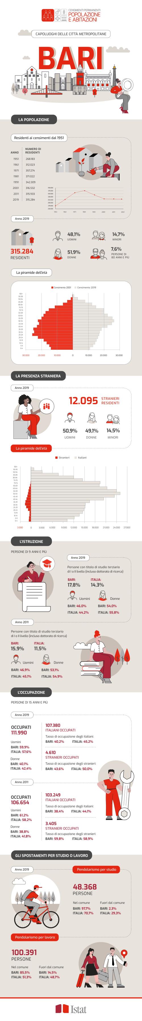 L'Istat pubblica nella sezione "Dati alla mano" dei nuovi contenuti riguardanti i capoluoghi delle attuali città metropolitane: Bari, Bologna, Cagliari, Catania, Firenze, Genova, Milano, Messina, Napoli, Reggio Calabria, Palermo, Roma, Torino e Venezia. Si tratta di infografiche che rappresentano i cambiamenti nella popolazione residente fra il Censimento generale del 1951 e il Censimento permanente 2019: struttura per età, presenza straniera, istruzione, occupazione, spostamenti per studio o lavoro. Per gli approfondimenti si può consultare la fonte.