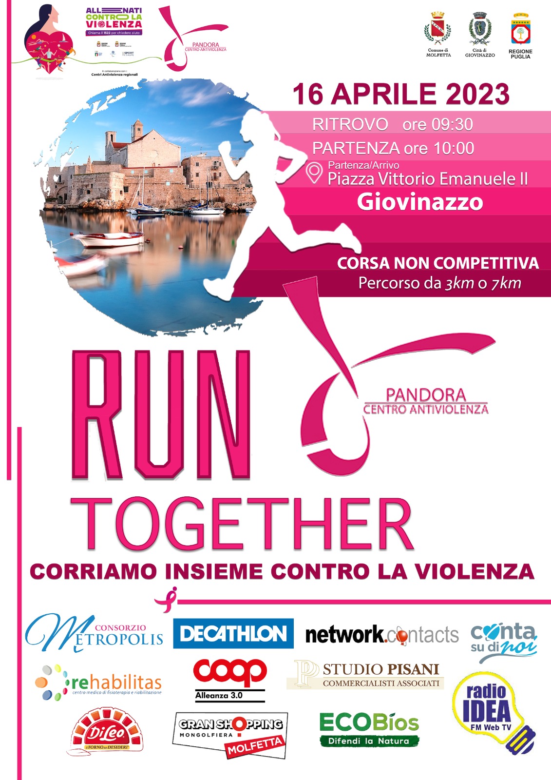 Torna anche quest’anno la “Run together - allenati contro la violenza” una passeggiata-corsa non competitiva, giunta alla seconda edizione, organizzata da Pandora, il centro antiviolenza dell'Ambito territoriale Molfetta e Giovinazzo.