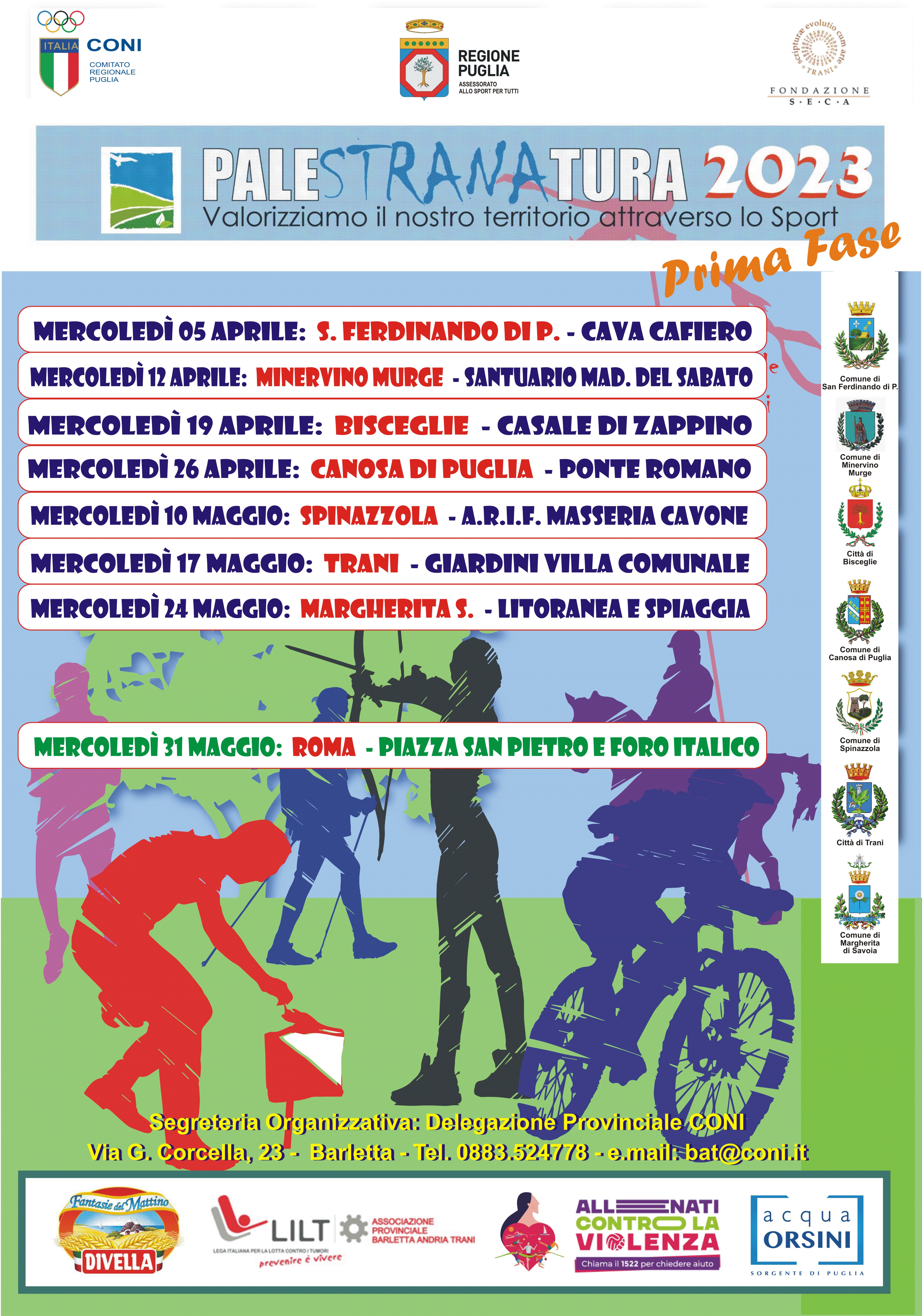 Prende avvio il 5 aprile a San Ferdinando di Puglia la IV edizione di PalestrNATURA 2023, la manifestazione sportiva organizzata dal CONI Puglia, attraverso la sua Delegazione provinciale del territorio della Provincia di Barletta Andria Trani.