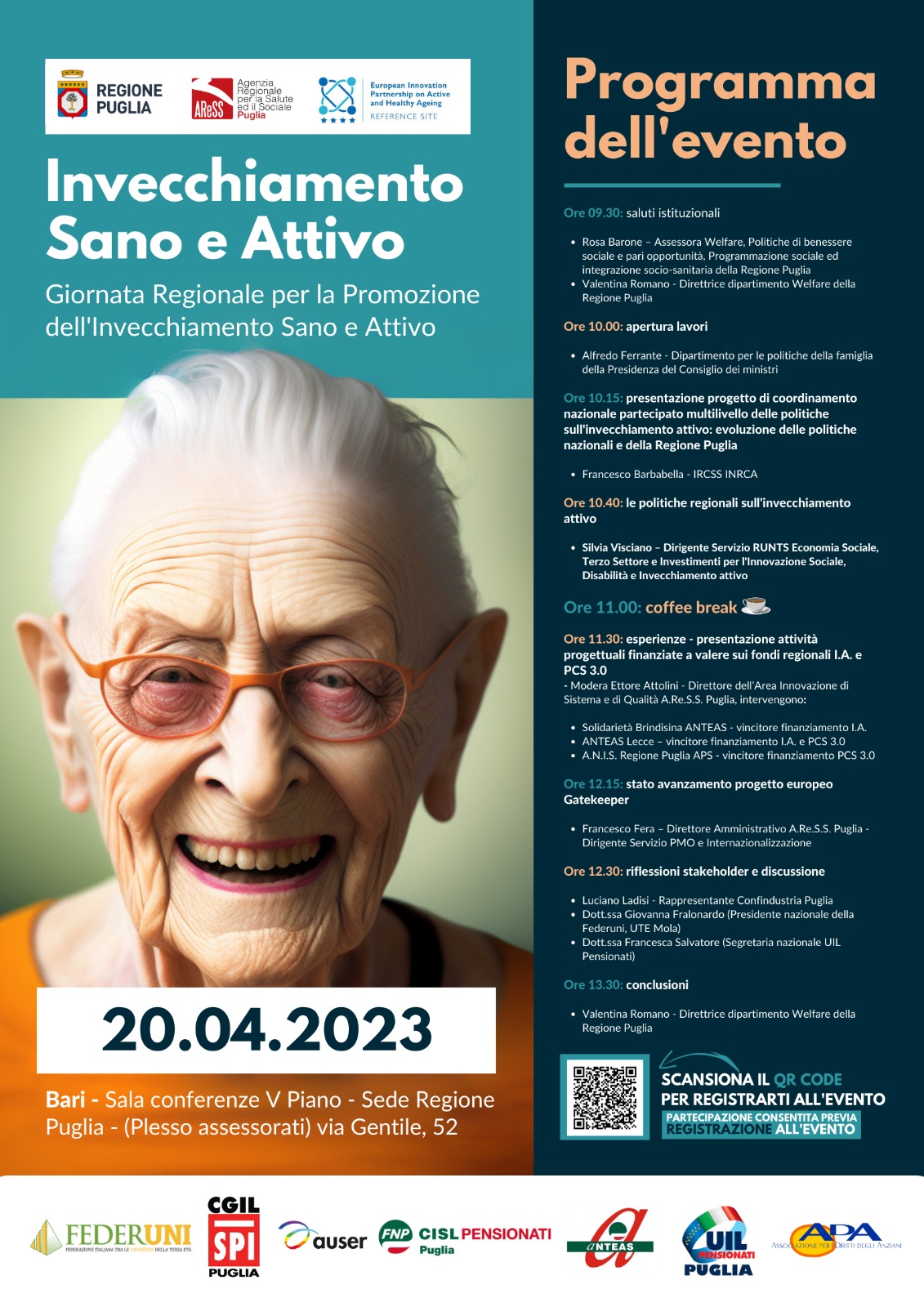 L’evento costituisce un’importante occasione per approfondire le strategie e le azioni intraprese dalla Regione Puglia per la promozione dell'invecchiamento sano e attivo, condividere esperienze e buone pratiche, e creare sinergie tra i diversi attori coinvolti.