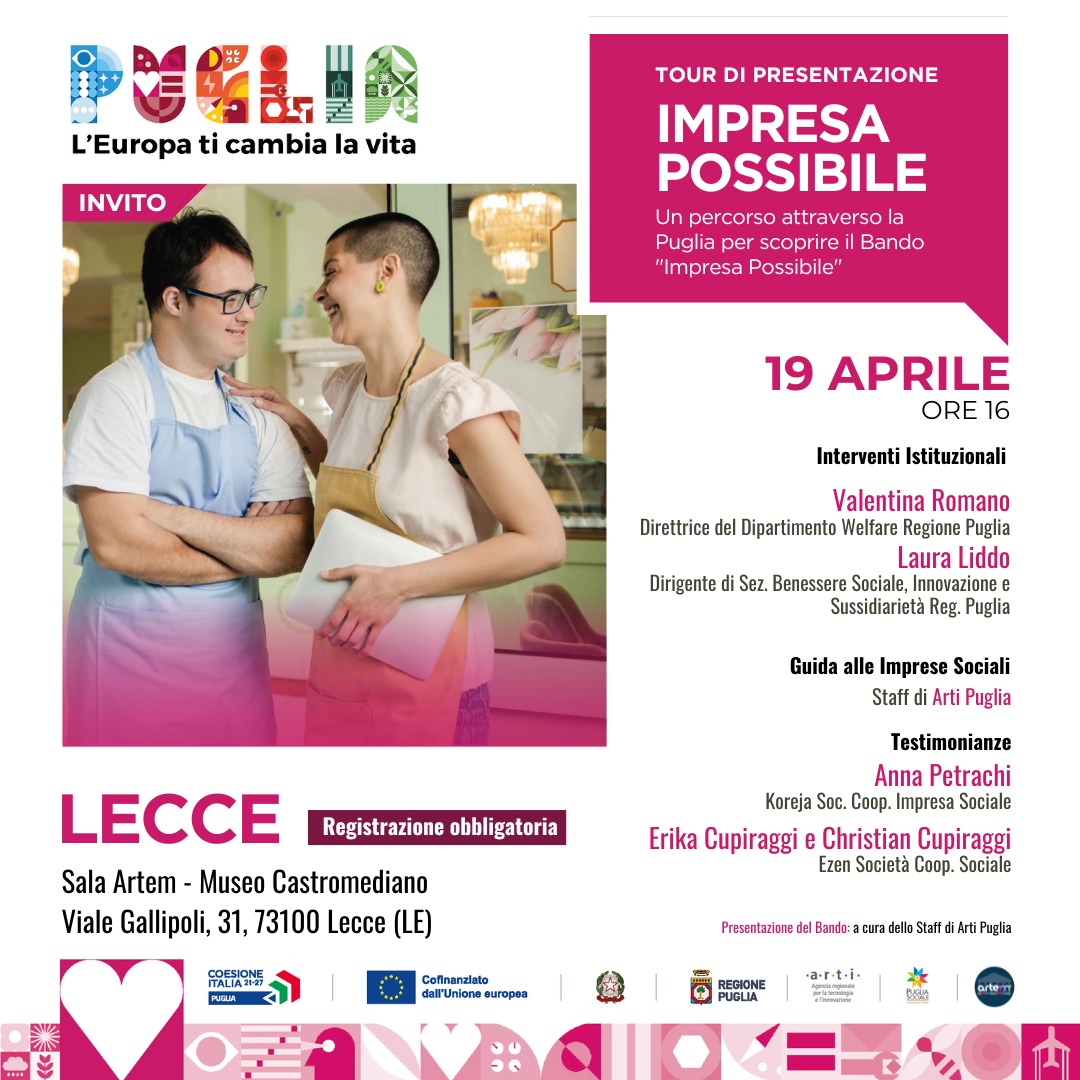 Il tour si rivolge alle imprese di innovazione sociale e del Terzo Settore e costituisce l'occasione per approfondire le specificità e le opportunità offerte dal bando, interagire con figure chiave e scoprire come il bando "Impresa Possibile" possa supportare e potenziare le attività imprenditoriali, contribuendo al contempo allo sviluppo sociale ed economico della Puglia.